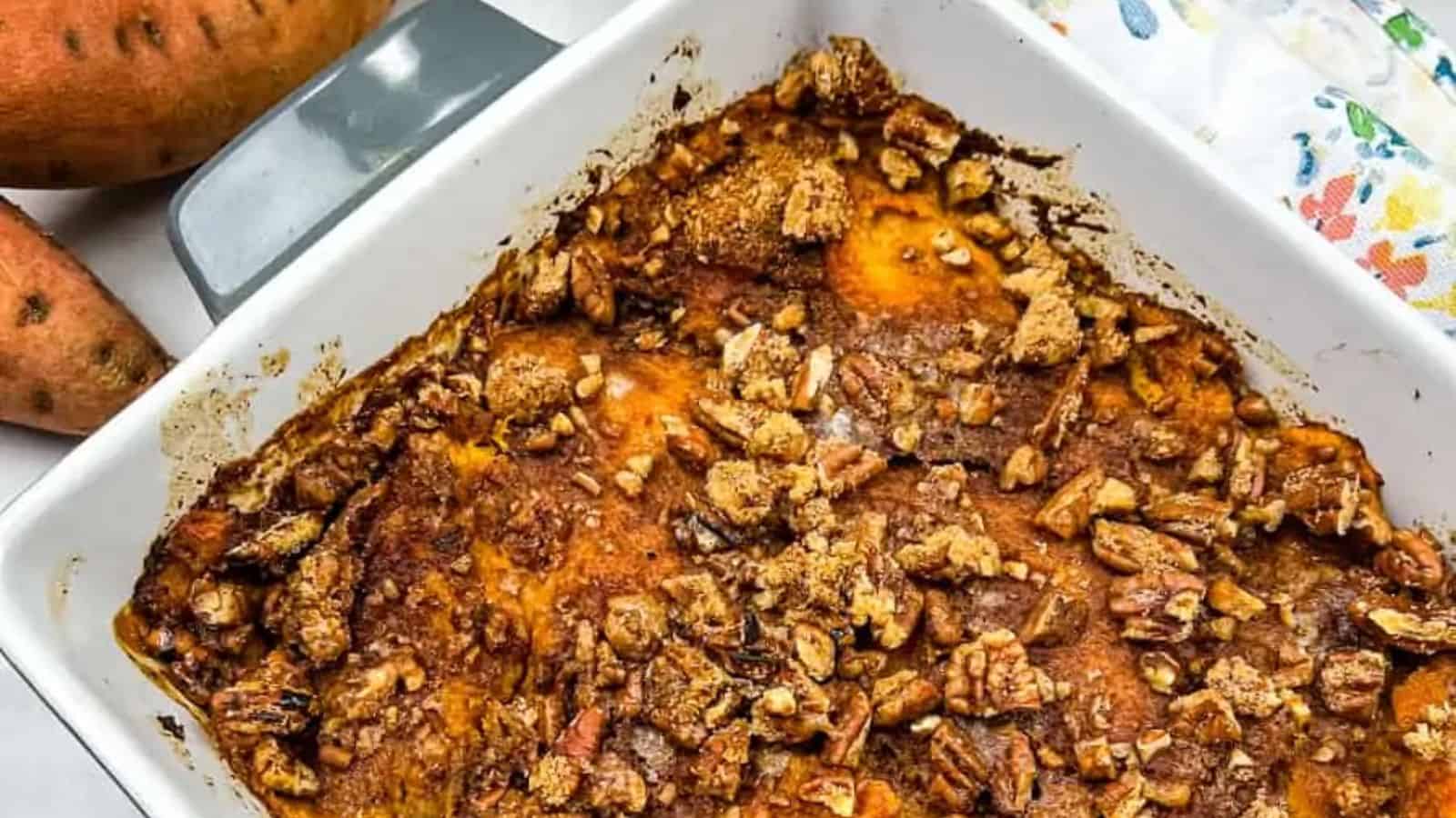 Sweet potatoes with caramelized pecans and cinnamon create a flavorful casserole. This casserole is practical because it adds a touch of sweetness to holiday or everyday meals.