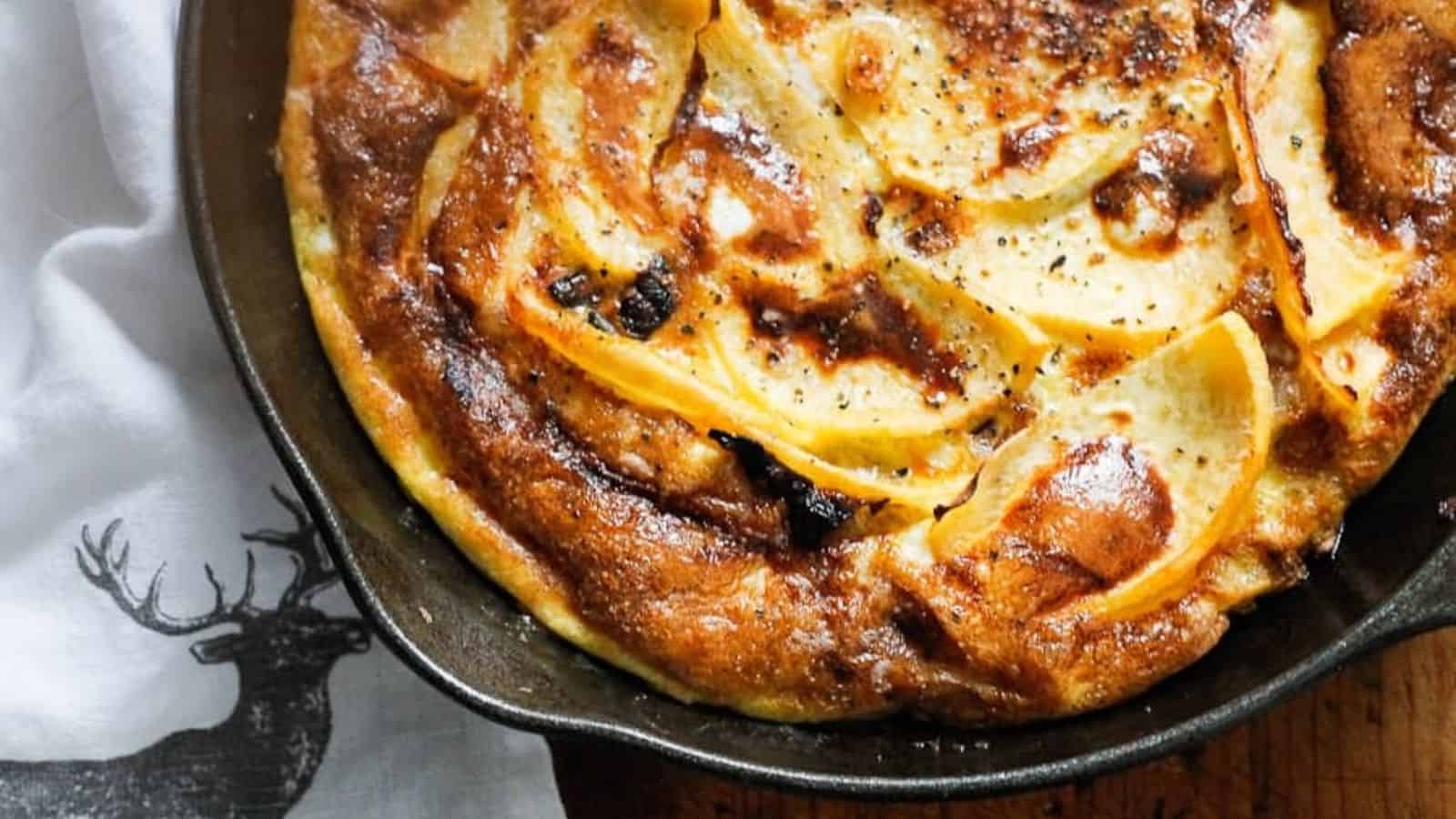 Caramelized onions and thinly sliced rutabagas baked with eggs create a nutritious breakfast for two to four people. It pairs well with sides and is simple to prepare.