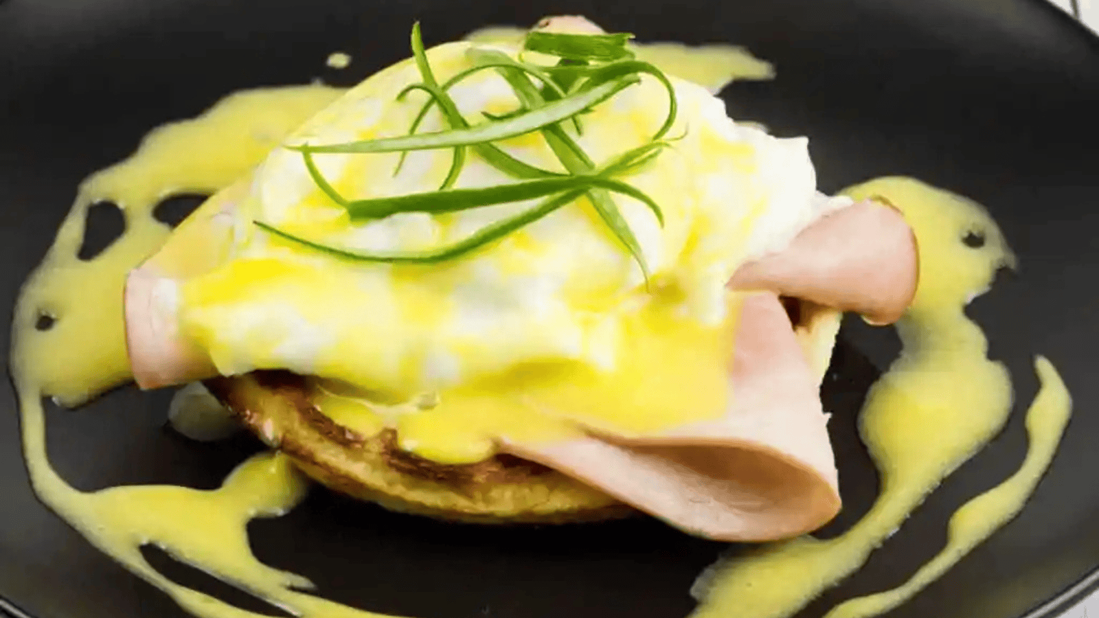 Eggs Benedict gets a new take with a crispy chaffle base. The poached egg and hollandaise sauce come together for a dish that’s great for brunch.
